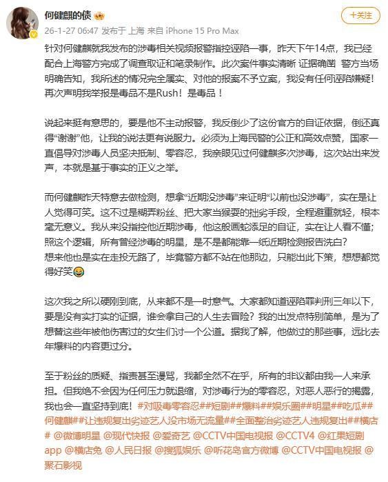 1月27日,举报者@何健麒的债 在社交平台发声,针对何健麒就我发布的涉毒相关视频报警指控诬陷一事,已配合警方完成调查取证和笔录制作。
