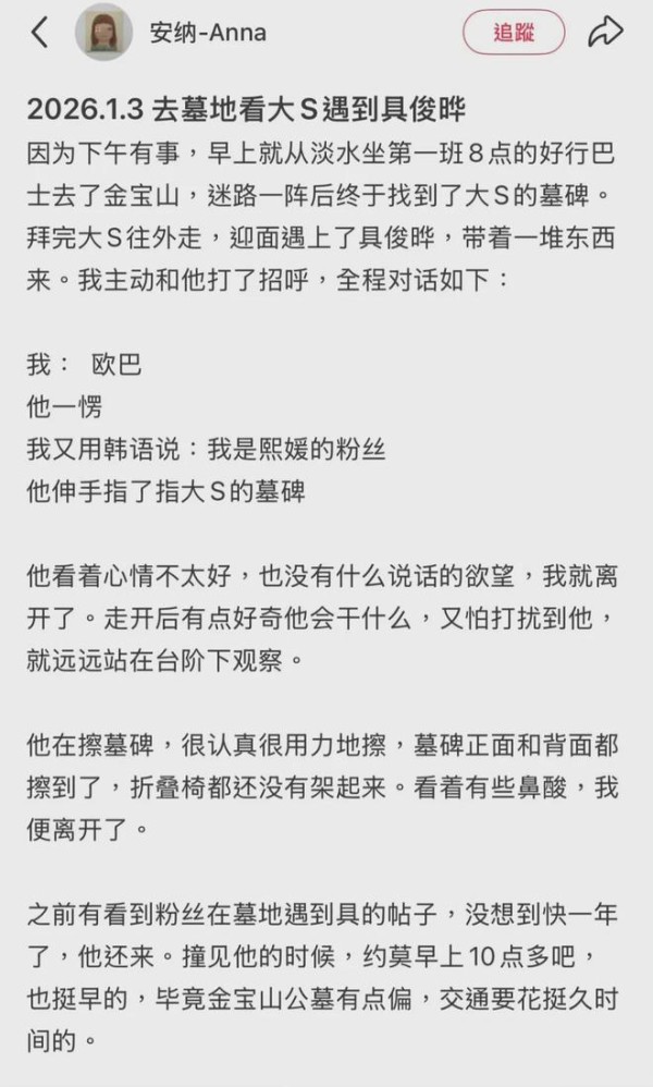 具俊晔天天到墓园看大S?网友多次巧遇曝真相