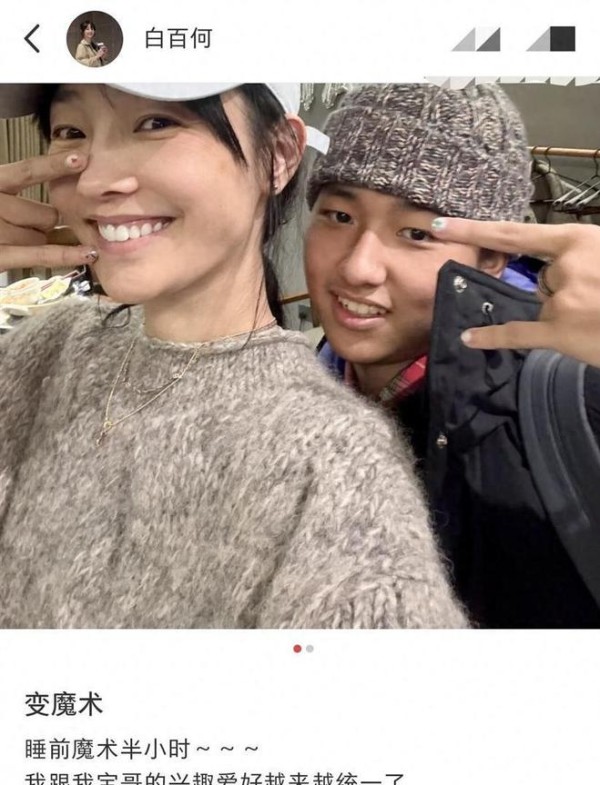 那晚她发的照片,光线特别柔和。 白百何戴着一顶浅灰色棒球帽,咧着嘴笑,眼角弯弯的,还是当年《失恋33天》里黄小仙那股子灵动劲儿。 她配的文字挺有意思,说现在儿子跟她的爱好越来越同步了,晚上能一起琢磨半小时魔术。 玩高兴了,就拍下了这组合影。 字里行间,没有一丝“为孩子牺牲”的苦情,倒像在炫耀一个能玩到一块去的挚友。