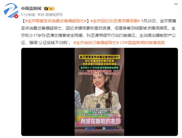 1月28日,金莎在与黄圣依聊天时透露,自己近期正忙于筹备婚礼。她回忆被男友孙丞潇求婚的场景时笑称,虽然过程浪漫,但“穿着羽绒服被求婚很搞笑”。