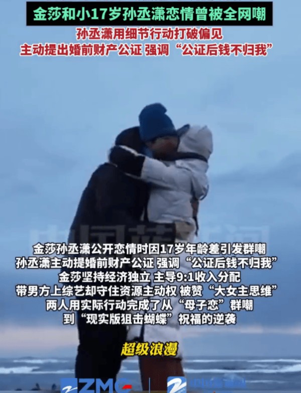 金莎与比她小17岁的孙丞潇的恋情曾一度引发网络热议。据透露,孙丞潇以细节行动逐渐打破外界偏见,不仅主动提出进行婚前财产公证,并明确表示“公证后钱不归我”。