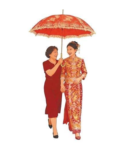 婚礼是人一生中最重要的仪式之一,海南各地婚俗中有不少讨彩头的环节。定安等地的新娘出嫁时,由一名伴娘打红伞护送,红伞象征着喜庆和吉祥,也有遮风挡雨、一生周全的寓意。在海口羊山地区,新娘一般由一位全福长辈(指父母、配偶、子女都有)打伞护送进门。