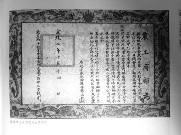 劝业会评审结束时,便将全部获奖名单在会场“列榜宣示,俾众周知”。南通收获的最高档次的“奏奖”由两江总督张人骏亲自为获奖者颁奖。海门80多岁高龄的刘旦诞老人带着自种的大红袍赤豆和旱稻米参展,双双收获银奖,劝业会除授予他获奖证书外,还赠予“孝悌力田”匾额,表彰他为各地农民做出了榜样。