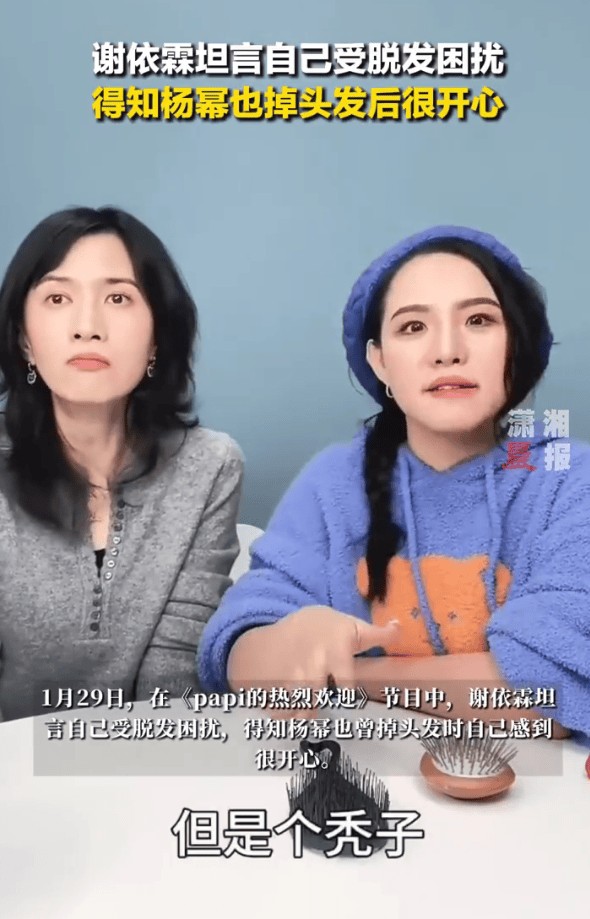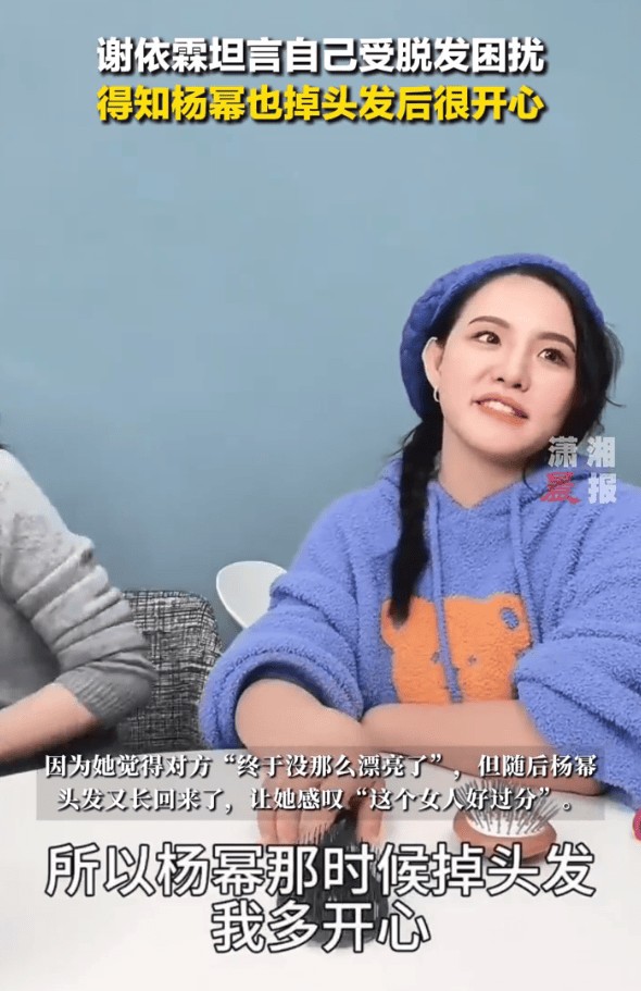 1月29日,在《papi的热烈欢迎》节目中,谢依霖坦言自己受脱发困扰,得知杨幂也掉头发时自己感到很开心。因为觉得对方“终于没那么漂亮了”,但随后杨幂头发又长回来了,让她感叹“这个女人好过分”。