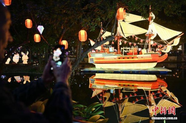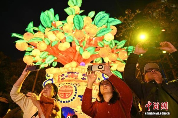 图为游客在“大吉大利”灯组前拍照。中新社记者 陈楚红 摄