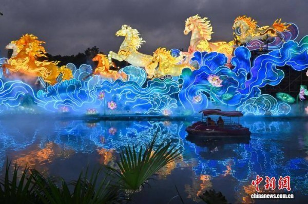 图为游客乘坐游船游览“万马奔腾”灯组。中新社记者 陈楚红 摄