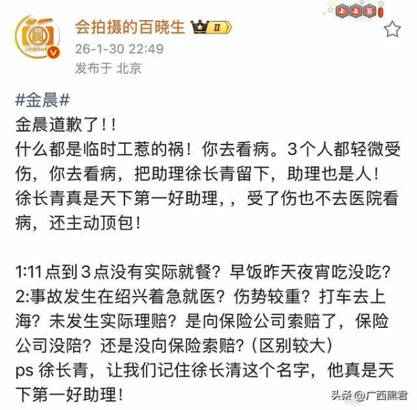 2月1日上午,金晨肇事顶包风波迎来新的升级,一众娱记集体发声表示完全不认可金晨此前发布的道歉声明,更是直接针对该事件的警情通报提出5点专业建议,公开呼吁当地公安分局重新全面调查此事,明确各方应承担的责任。这场从肇事顶包指控开始的风波,在官方发布澄清通报、金晨公开致歉后,非但没有平息,反而因娱记的硬刚变得更加扑朔迷离,狗仔更是直言这场风波的真相远比吃瓜群众想象的更炸裂。