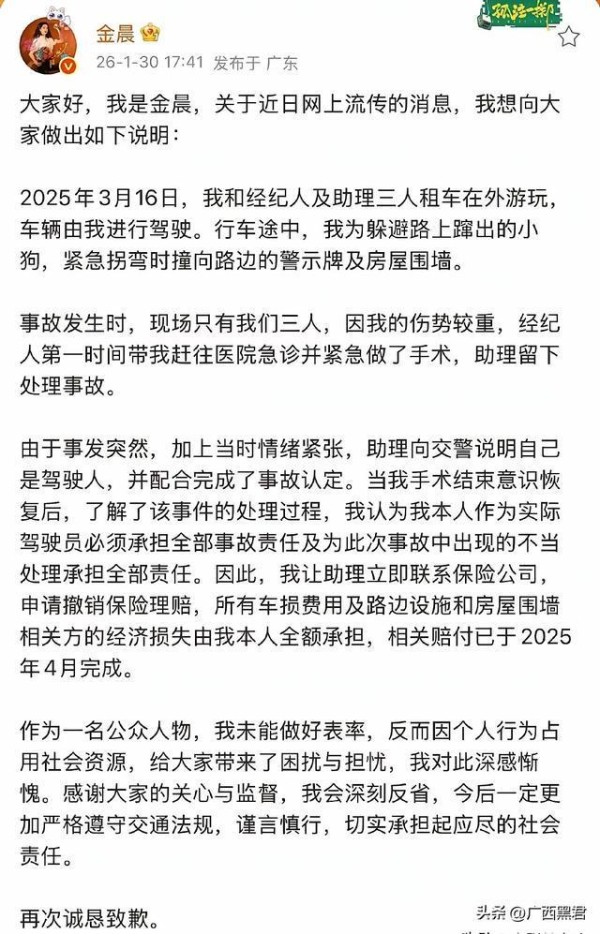 警方通报金晨被曝肇事逃逸,金晨发文致歉:为躲避蹿出小狗撞墙,伤势较重先行就医手术