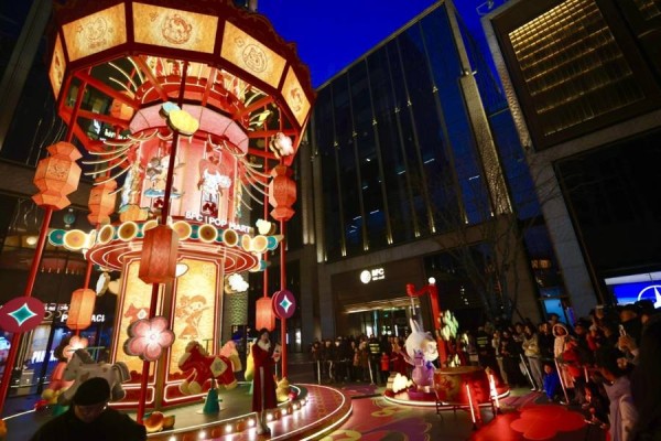 随着倒计时的呐喊声,位于BFC北区广场的宫灯旋转木马装置瞬间点亮新春夜空。传统宫灯的朱红飞檐下,暖黄灯箱勾勒出12个泡泡玛特经典IP形象,宛如将童话藏入中式画框;下层木马在光影中交织出马年的奔腾意象与喜庆的年节氛围,拉布布(Labubu)的萌趣灯组与旋转木马相映成趣。