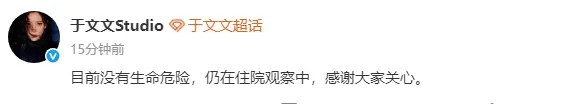 事后,于文文工作室发文向公众报平安,称“目前没有生命危险,仍在住院观察中,感谢大家关心。”