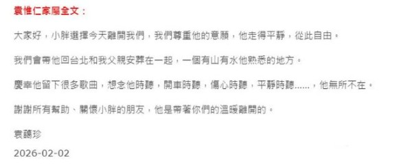 台媒也曝光了袁惟仁家属所发布的悼念文,文中表示,袁惟仁选择今天离开我们,我们尊重他的意愿,他走得很平静,彼此自由。