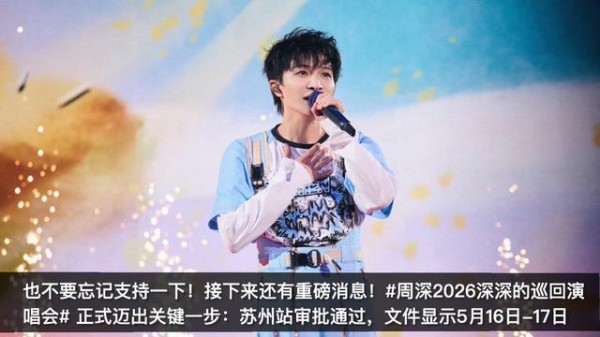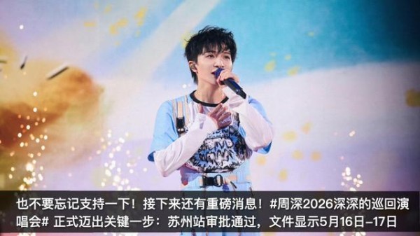 接下来还有重磅消息!#周深2026深深的巡回演唱会#正式迈出关键一步:苏州站审批通过,文件显示5月16日-17日,周深将于苏州奥体中心体育场连开两场。"深深的"巡演作为2025年同名巡演的延续,主题继续围绕"人生日记",以声音与情绪为核心,并在舞台设计与视听呈现上全面升级,打造更具沉浸感的情绪化现场。