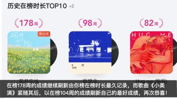 另外,在歌曲三大维度方面,这首《万里》还拿到了"推荐度TOP1"。值得一提的是,在里程碑方面,周深的歌曲《花开万优》在榜178周的成绩继续刷新由你榜在榜时长最久记录,而歌曲《小美满》紧随其后,以在榜104周的成绩刷新自己的最好成绩,再次恭喜!