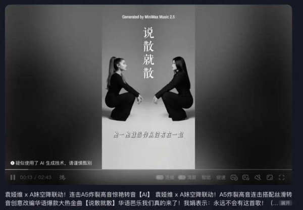 有音乐区UP主尝试用MiniMax Music 2.5 模拟“A 妹”爱莉安娜·格兰德(Ariana Grande)的音色生成中文歌曲,结果那标志性的 5A 高音连击稳得让人头皮发麻。更难得的是,那些自然的转音与颤音中,竟带着一种极其抓人的破碎感与情绪张力。