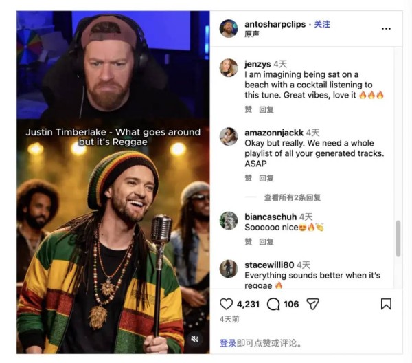 “戏仿格莱美”视频中复刻了多位格莱美入围歌手的作品,从编曲到配器极度还原原歌手风格,甚至演唱也能清晰捕捉到每一次吐字的口齿摩擦;另一位MiniMax Music 2.5 玩家模拟贾斯汀·廷伯莱克(Justin Timberlake)的音色创作了一首雷鬼歌曲,评论区有人惊叹“氛围感直接拉满。”