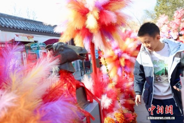 2月4日,小朋友在北京圆明园海棠书院参观马兽首模型。当日是二十四节气中的立春,圆明园海棠书院内装点了彩色毛绒烟花,为游客营造出新春的暖意和生机。中新社记者 易海菲 摄