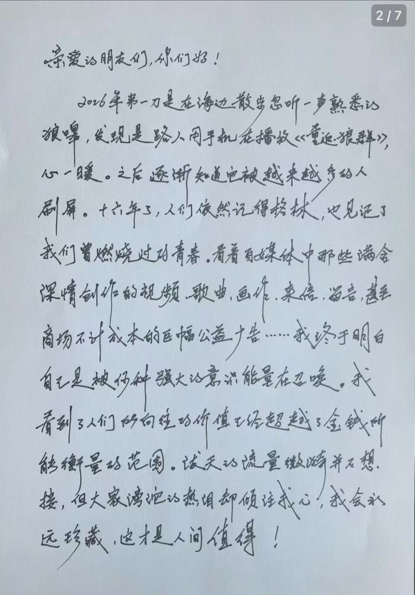 2月2日,电影《重返·狼群》发布定档海报,宣布将于2月19日大年初三重映。李微漪手写长文感谢大家支持,并回应“16年了,没有永恒的生命,尽管那是我们的美好愿景”。同时,流量也为湿地保护区和野生动物带来了困扰。她呼吁大家保持距离“不去打扰是我们最温柔的祝福,把爱藏在心里,把空间还给自然。”