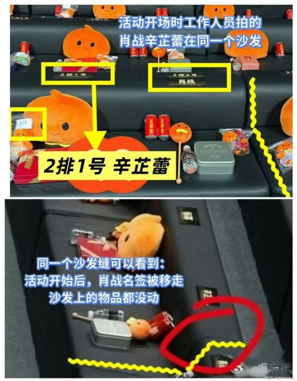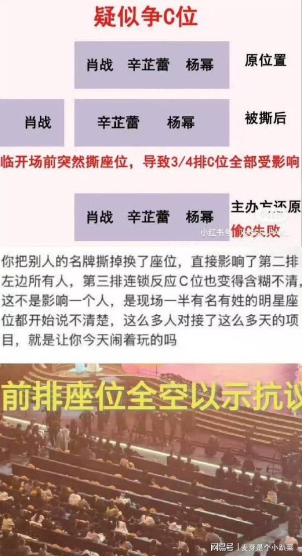 原因就是疑似要和辛芷蕾这个国际影后争C位,把肖战的名牌撕了换到另一个座位,把三人座的椅子变成了两人座(全场都是三人座,第一排的那些业内老总也不例外)导致后面的艺人对不齐前面的迟迟无法落座。