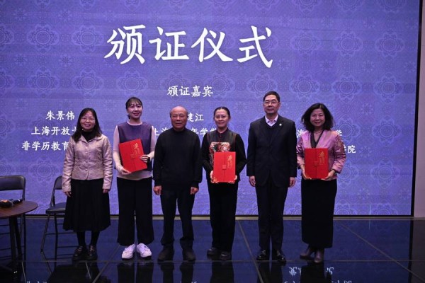 上海市老年学学会会长朱建江与上海开放大学人文与公共管理学院党总支书记林晓英、非学历教育部部长朱景伟一起为三位主讲嘉宾颁发荣誉证书。