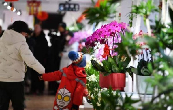 圆明园新春花事会场整体布置以“花间·画境”为主题,设有“花树祈福”、“庭院花境”、“油画框”、“花瀑迎春”等多个拍照打卡点位,颜色以大红、暖黄为主,营造春意正浓的节日氛围。