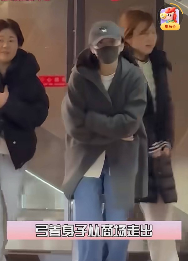 景甜陪妈妈逛商场,双手叉腰捂着肚子走出来,表情痛苦不像冻得