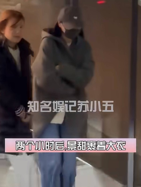 当天景甜的状态不是很好,弓着身子、双手抱怀,看到有媒体在拍,也没有换一个动作。