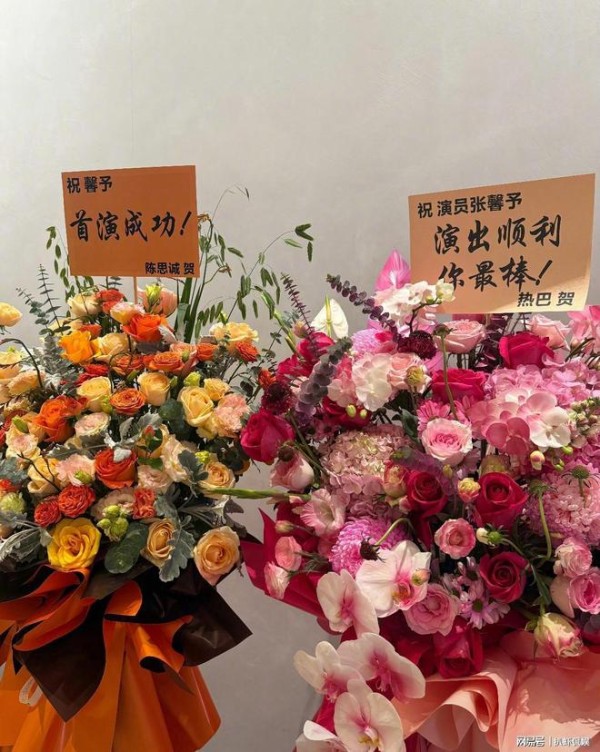 另外,何捷的父母也为儿媳妇送去花篮,上面写着“祝美丽儿媳馨予首演圆满顺遂”传递认可。