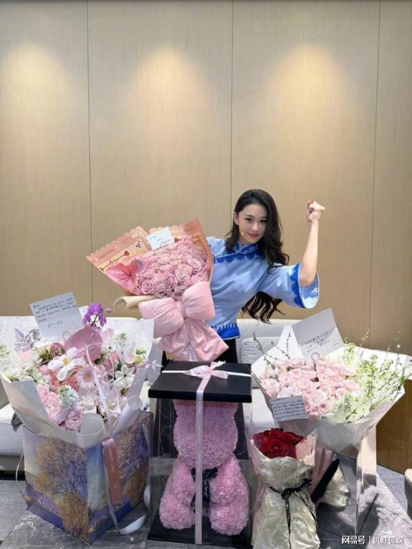 只见她在后台与礼物合影留念,还伸手握紧拳头,预示演出一定会成功。