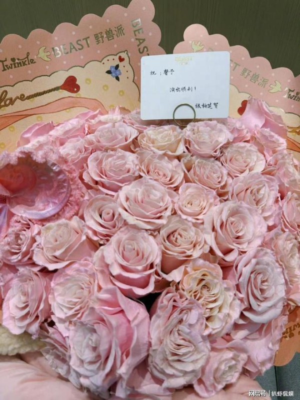 张柏芝的花篮全是粉色玫瑰,浪漫、温馨突显二人姐妹情。