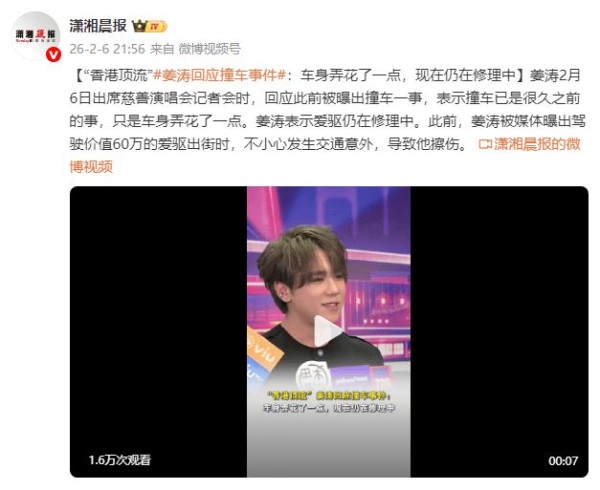 2月6日,姜涛现身慈善演唱会记者会,被追问早前撞车传闻,终于正面回应。他轻描淡写说只是旧闻、车身小刮花,还坦言爱车还在修理厂没取回,全程态度淡定,反倒让网友议论更热了。