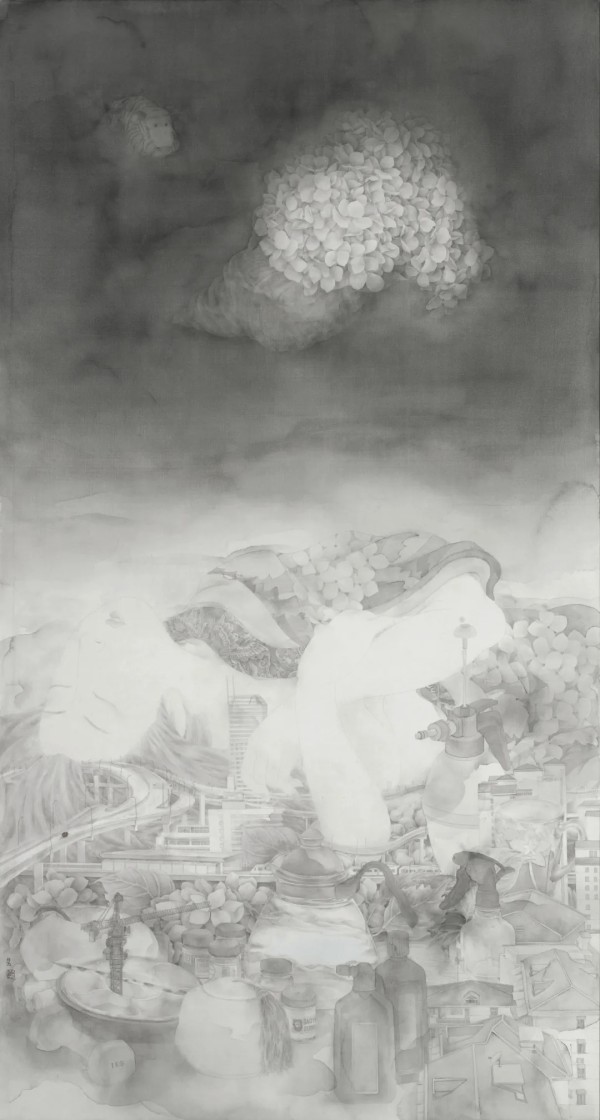2019年创作的《隔》系列,描绘了日常旅途中的一瞥。它们或许是高速公路上的隔音板,将隆隆向前的城市发展与袅袅升腾的人间烟火悄然分隔;又或是永不拓宽的老马路上,那竹篾编织的篱笆,在川流不息的车道与静谧自处的庭院之间划下温柔的界线。艺术家以细腻的笔触与水墨的写意,将“隔”所带来的遮挡与留白转化为画面的韵律,引人遐思:那是对墙外世界的好奇,也是对消弭隔阂的深切向往。