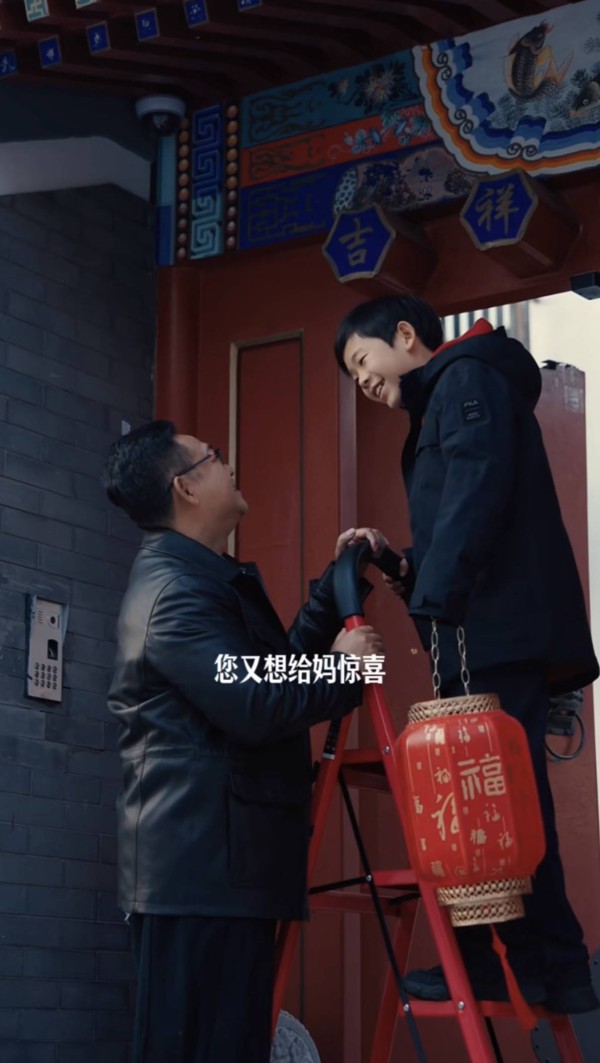 姜武和儿子一起挂灯笼,他们搬来一个红色的折叠梯,儿子踩着梯子上去挂灯笼。姜武提醒儿子小心一些,儿子很放心说“爸,有您在呢”。