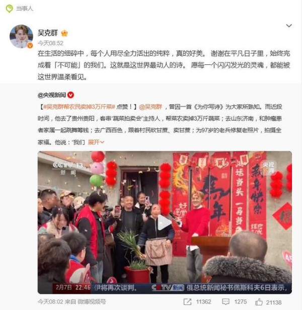 吴克群帮菜农卖掉3万斤蔬菜,本人表示:每个人用尽全力活出纯粹