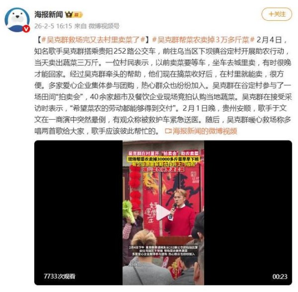 一句“在生活的细碎中,每个人用尽全力活出的纯粹,真的好美”,让歌手吴克群最近再次刷屏。不过这次,不是因为新歌,而是因为他客串“蔬菜拍卖师”,一小时帮贵阳菜农卖掉3万斤滞销蔬菜的暖心操作,被网友戏称为“从《为你写诗》到‘为你卖菜’”的硬核转型。