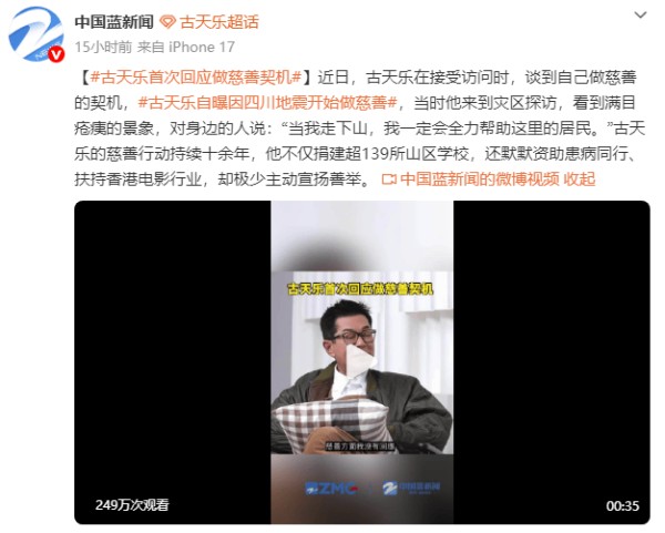 近日,古天乐在接受访问时,谈及自己做慈善的契机,称因四川地震开始做慈善,当时他来到灾区探访,对身边的人说:“当我走下山,我一定会全力帮助这里的居民。”古天乐的慈善行动持续十余年,他捐建超139所山区学校,默默资助患病同行、扶持香港电影行业,但是极少主动宣扬善举。