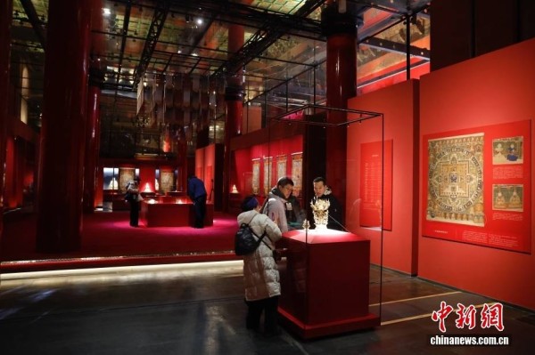 2月9日,由故宫博物院联合西藏自治区文物局等多家文博单位共同举办的“万法归一:萨迦寺历史文化与艺术”展在北京故宫博物院开幕。展览精选200余件珍贵文物,以“萨迦寺的历史”“九州一统”“萨迦时代的文化与艺术”“萨迦派的珍藏”四个单元,展现萨迦寺近千年的历史积淀、艺术特色,及其在中华民族多元一体进程中的重要作用。图为嘉宾参观展览。中新社记者 韩海丹 摄