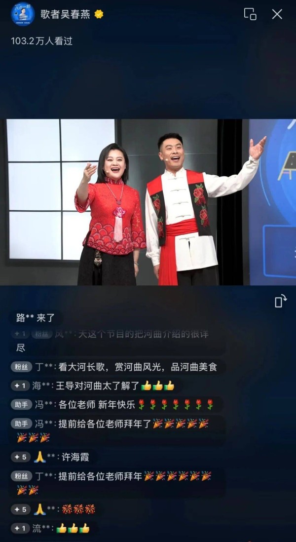 节目播出期间,观众反响极为热烈,互动评论持续刷屏。悠扬的歌声瞬间点燃了直播间,观众纷纷赞叹“耳朵怀孕了”“唱得太赞了”“河曲民歌太顶了”。许多人表达了对非遗艺术的浓厚兴趣与向往:“必须去河曲旅游,看大河长歌,品河曲美食”,并具体提及娘娘滩、 白朴公园等文化地标。