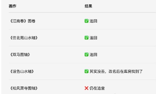 目前,已经流转社会的五幅画作已经追回了四幅,仍收藏于南博,还有一幅在继续查找中;