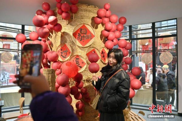 图为民众与冰糖葫芦模型合影留念。中新社记者 张瑶 摄