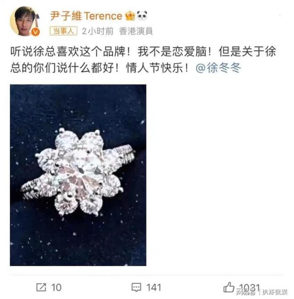 官宣恋情时,尹子维还晒出自己为徐冬冬挑选的钻戒,纯白无瑕中间镶嵌着一颗大水晶,网友十分羡慕。