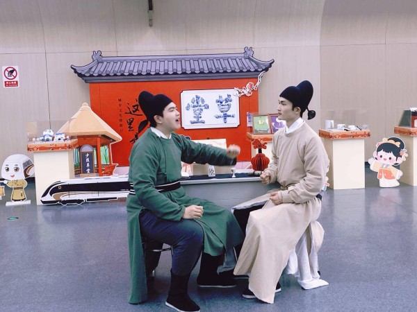 2月11日上午,成都地铁13号线杜甫草堂站的C出口站厅内,新春的喜庆氛围和古典的诗意氛围,通过两位“唐代诗人”的现场演绎,为一群群出站的旅客们带来惊喜。