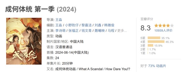这些极具辨识度的标签加持也让这一IP在此前先后改编成动漫和竖屏微剧并双双取得亮眼成绩。其中率先面世的动漫版已推出两季,2024年第一季在爱奇艺播出后刷新平台自制动画热度值记录、豆瓣评分高达8.3分,不久前开播的第二季亦是开播即霸榜;去年暑期在爱奇艺上线的S级同名竖屏微剧则在首播日便创下了猫眼短剧热度的历史新高。