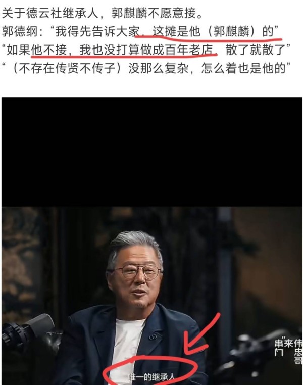 “郭麒麟是德云社唯一的继承人,如果郭麒麟不接班了,那么德云社该散就散吧!我也没想过要把它做成一百年。”