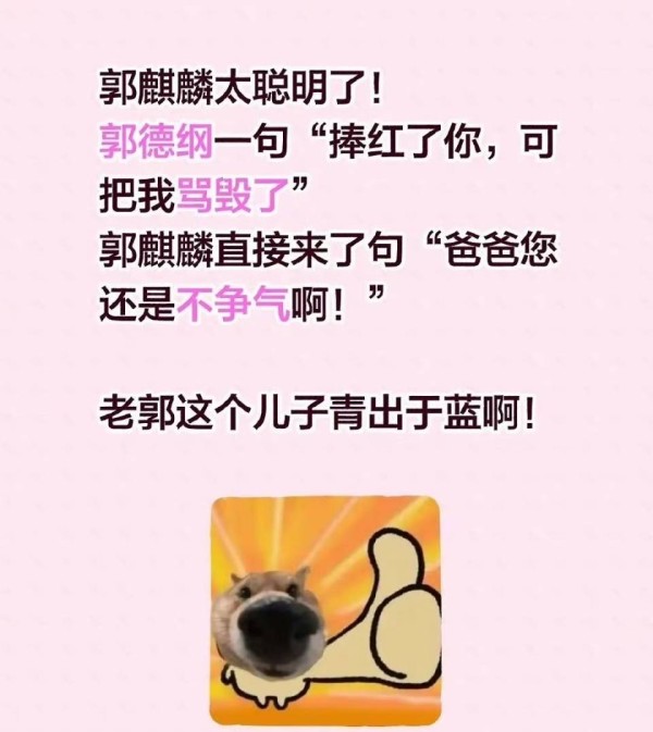 类似这样的描述引来情商、智商双高的郭麒麟的即时“反击”——爸,那你还得再争点气啊。