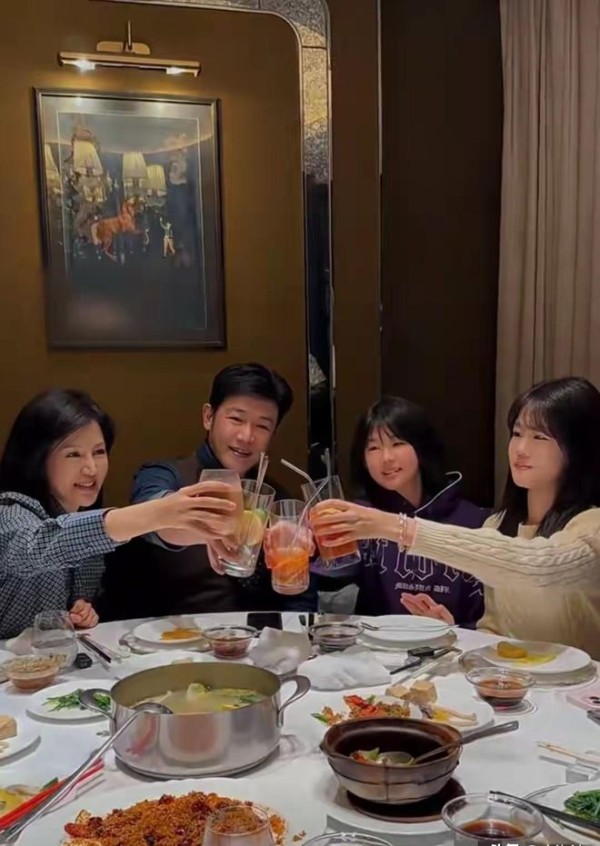陆毅鲍蕾晒家庭聚餐,四人举杯迎接新年,两个女儿如花似玉陆毅鲍蕾一家四口颜值引关注 大女儿已超过妈妈身高