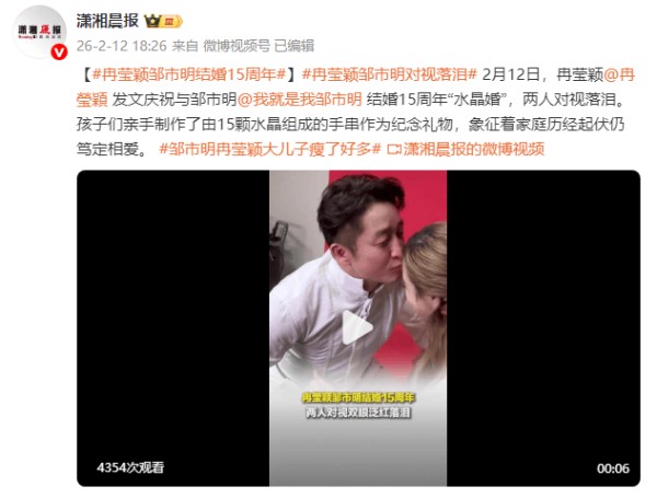 2月12日,冉莹颖在社交平台发文,纪念与邹市明结婚15周年的水晶婚,两人深情对视、感动落泪。孩子们还亲手制作了一串由15颗水晶组成的手链当作礼物,寓意一家人历经风雨,依旧相爱相守。