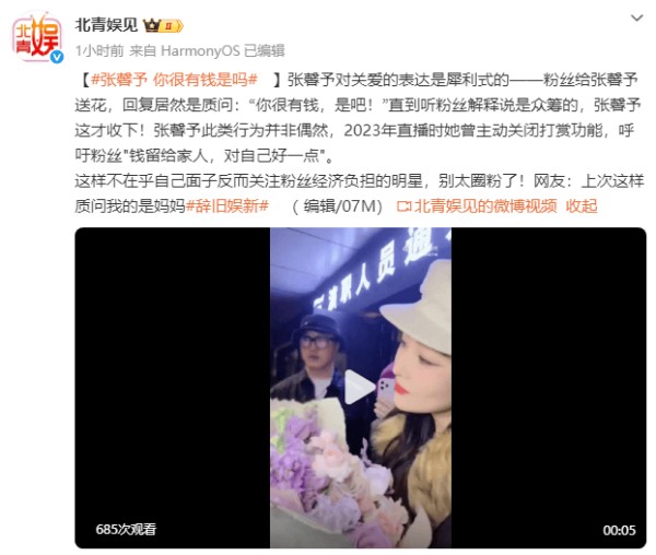 张馨予的关心向来直白又犀利——有粉丝给她送花,她当场直言反问:“你很有钱是吧!”直到得知鲜花是大家一起众筹买来的,她才暖心收下。其实这并非个例,早在2023年直播时,她就主动关掉打赏功能,劝粉丝把钱花在家人和自己身上。
