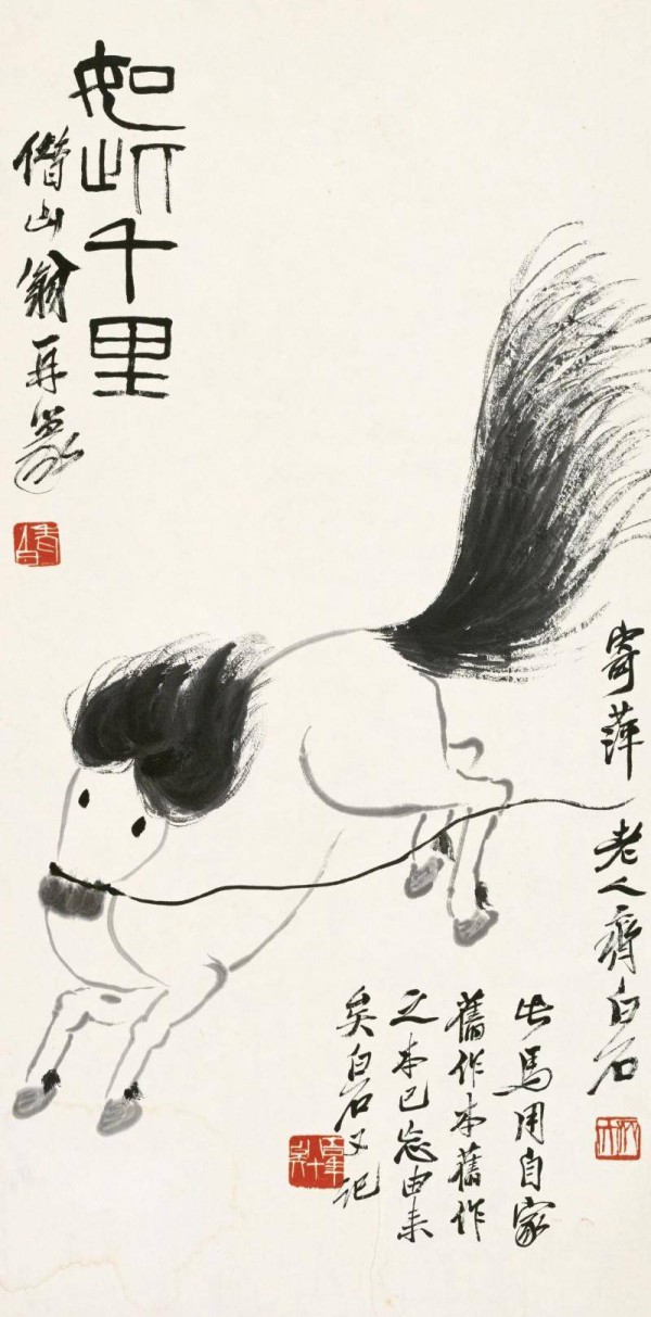《如此千里》创作于1940年,是齐白石80岁晚年佳作,为其罕见成套《十二属图》中的生肖马主题作品。画面以寥寥数笔淡墨写就,小马鬃毛飞扬、神态朴拙,线条洒脱不羁,既藏着乱世之中的精神自守,也尽显老人天真烂漫的艺术童心。这幅水墨立轴历经岁月珍藏,现为北京画院重要馆藏,也是本次跨省展出的核心珍品之一。
