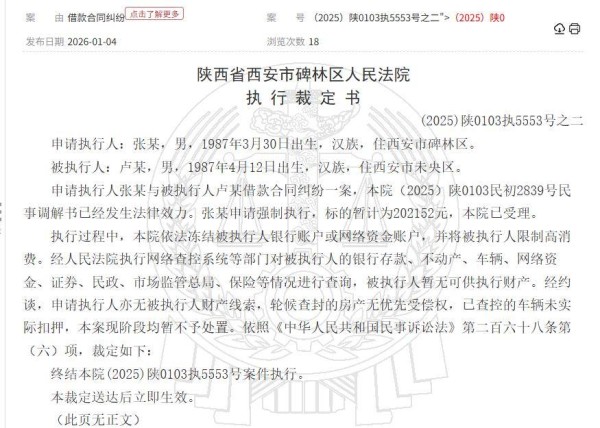 此外,记者还发现,张玉浩曾于2025年9月10日就另一笔金额为36.65万元的案件,向法院申请对西安卢鑫玉浩文化传媒有限公司进行执行。该案涉及的执行内容包括支付迟延履行期间的债务利息以及5398元的案件申请执行费。法院立案后,于2025年12月15日发布了对西安卢鑫玉浩文化传媒有限公司和卢鑫个人的限制消费令。12月16日,法院宣布对该案件进行终本处理,未履行金额36.65万元的债务仍未得到清偿。 值得注意的是,卢鑫的短视频账号的最后一次更新时间为2026年1月9日,进一步引发了外界对其现状的关注。