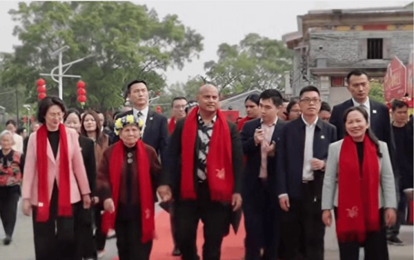 当日上午,忠心里村口张灯结彩,狮鼓齐鸣,族亲们身着节日盛装夹道迎宾,处处洋溢着喜庆的新春氛围。阿迪昂总统刚一抵达,便在人群中认出了82岁的堂外祖母谭惠霞,他快步上前亲切问候,随后与族亲一同来到村口大榕树下。此处,当地书法家正挥毫泼墨,为村民书写春联和“福”字,墨香阵阵中,浓浓的年味儿与文化气息扑面而来。